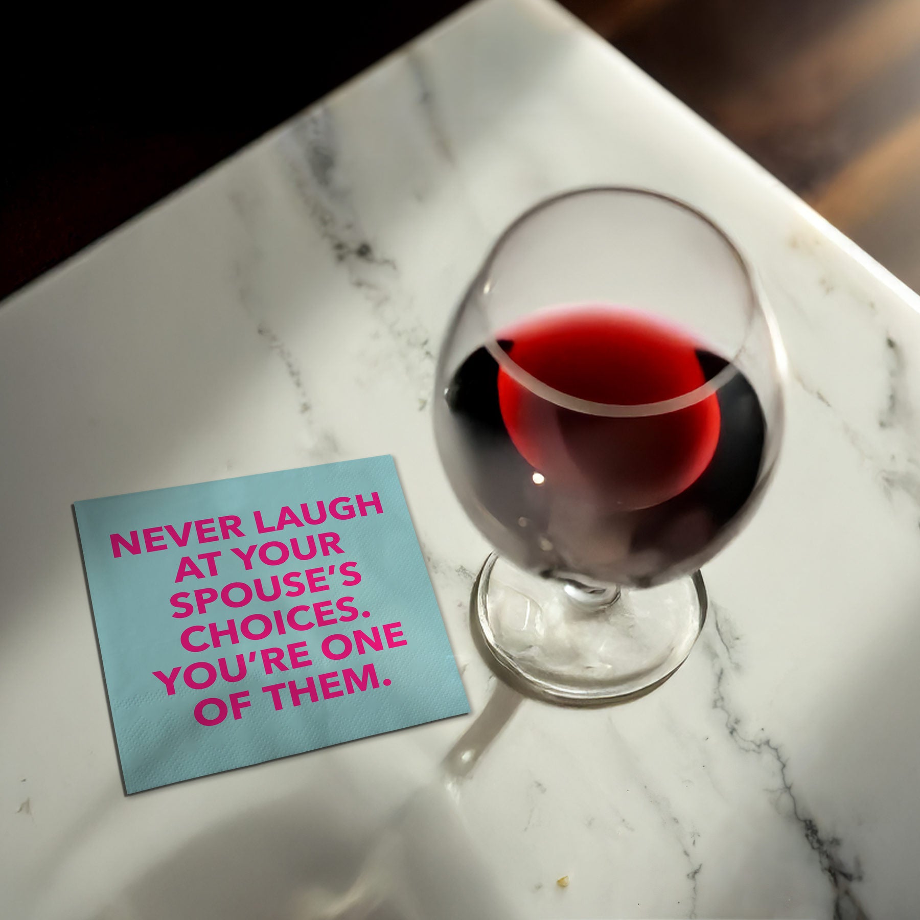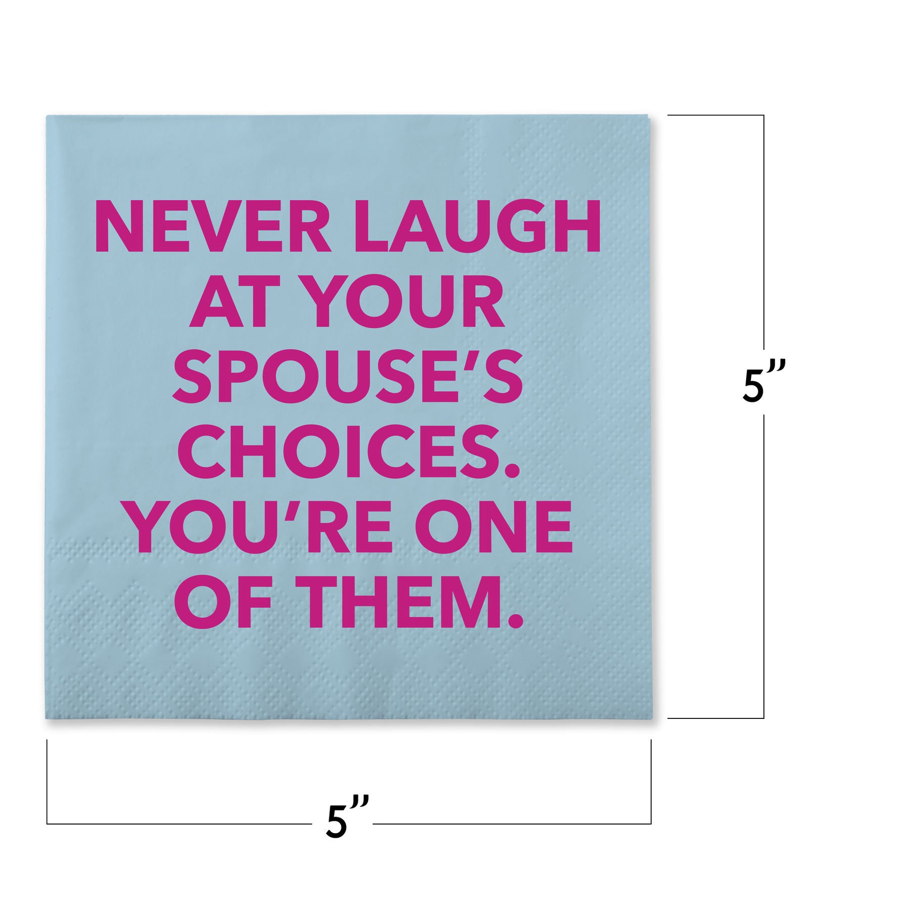 Get ready to laugh with our new cocktail napkin! Perfect for entertaining, it features a witty phrase that will have everyone in stitches. Let loose and enjoy the humor with your spouse, because let's face it, you're one of their choices. Cheers to a good time! (Spouse not included.)